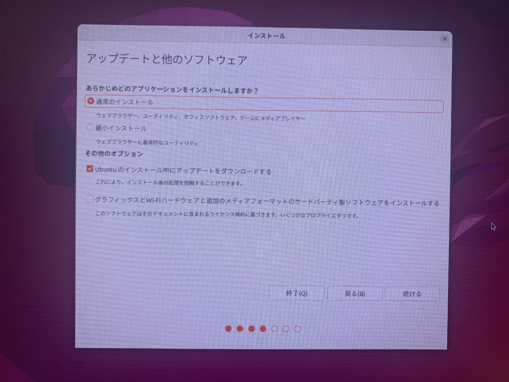 「アップデートと他のソフトウェア」では、「通常のインストール」を選びました。