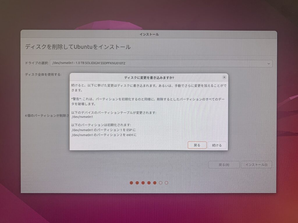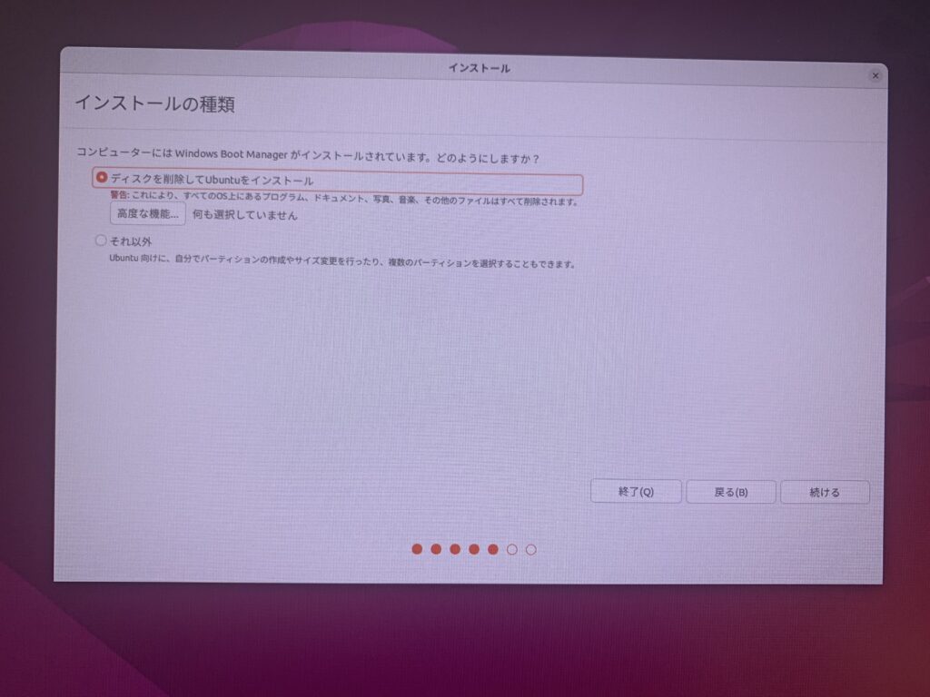 「インストールの種類」では、「ディスクを削除してUbuntuをインストール」を選びました。