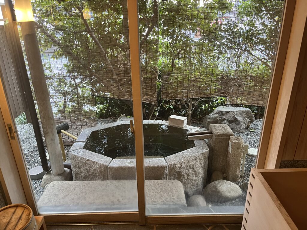 露天風呂付きの「桜」というお部屋に泊まらさせていただきました。大浴場ももちろん素晴らしいのですが、こうしたプライベート感のあるお風呂も、たまにはいいものです。
